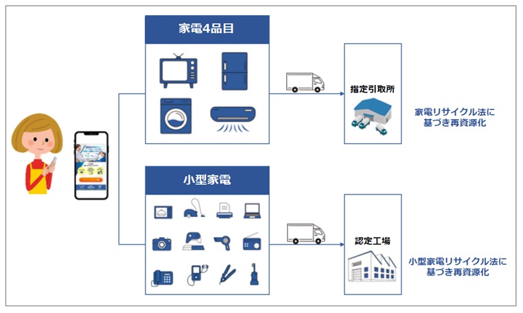 この度、両社は業務提携し、使用済み家電の処分に関する課題解決や利便性向上を目的として本サービスを開発しました。今後は、本提携を通じて、家電リサイクル法・小型家電リサイクル法のそれぞれで求められる要件を網羅した運用を構築し、営業面でも連携して使用済み家電の回収インフラを拡大していきます。