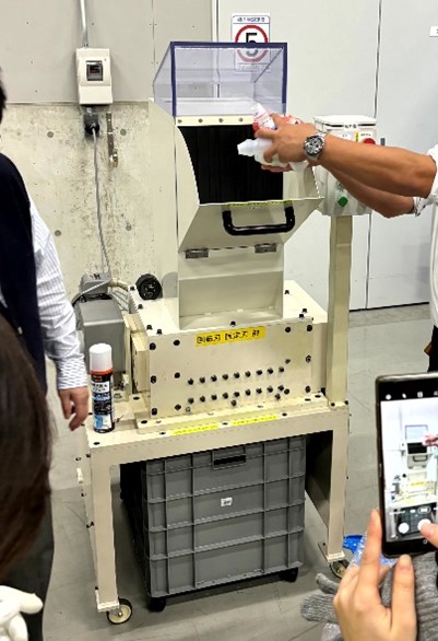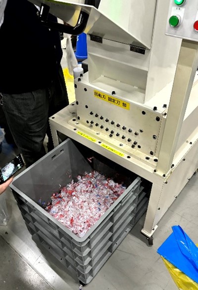 2024年3月16日には、ヤクルト、Mizkan、リスパックが製造・販売した食品の使用済みの容器(乳酸菌飲料容器、納豆容器、弁当容器のフタ)を、品質や量を調査、選別した上で、当社の破砕機を用いて破砕し、フレーク製造を行いました。