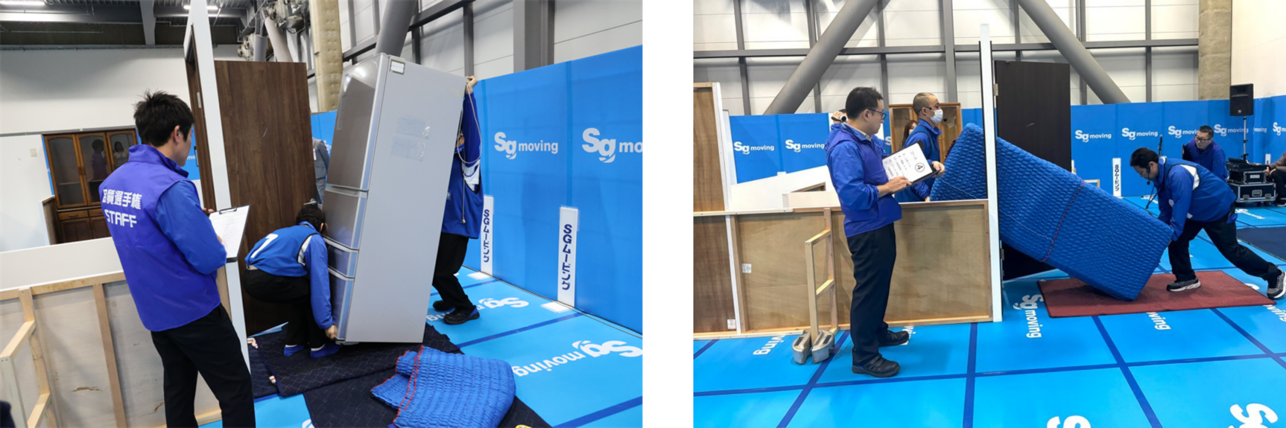 品質選手権では、SGムービングの主要な事業の一つである大型家具・家電の設置技術、サービス品質の高さを競います。今回は全国から自社営業所、協力会社を含め25チーム50人が競技に参加し、実技競技と学科競技を実施しました。実技競技では、近年受注件数も多い大型冷蔵庫の搬入を2人1組となり、住宅を再現した競技ブースで、玄関先での挨拶から設置、撤収までを行いました。審査基準には作業技術だけでなく、お客さま対応や作業時間など細かい基準を設けています。また、学科競技ではお客さま宅訪問時の基本的なマナーから、家具・家電設置時の基礎知識に関する問題が出題されるなど、SGムービングの品質の理解を問う試験が行われました。